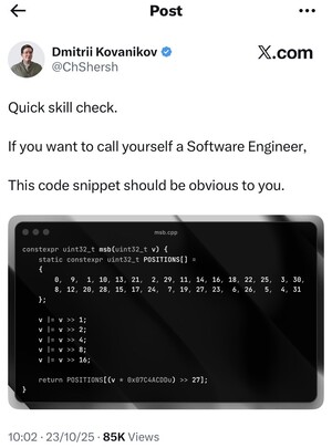 The code is slightly incomplete, if v is 0 or v is 1 then asnwer is the same: 0. If not used with "care" then an user could conclude the msb of 0 is at bit 0. Of course the standard solution is to restrict the caller: "v must not be 0", however, this feels incomplete, it should be valid to ask for the msb of 0. To address this, we must add more complexity. One possibility is to check v and reserve a return value for "no bit is msb", e.g. 32. This forces the user to rely on documentation in order to make the actual check against 32, a completely arbitrary value. Another is to use exceptions, but the overhead might be considered too much. A half-functional approach could be used as well, a struct with a validity field that can be set without branching e.g. ~v && 0xFFFFFFFF. This approach uses more memory, but forces the user to "unwrap" the value. While it is not ideal because the user can still unwrap invalid values it may remind the user that invalid values do exist. Bottom line, wouldn't it be cool if you could just select if you want the "incomplete" or the "complete" versions or as a consequence of the properties of the context in which the msb would be calculated a version is automatically selected and properly justified?